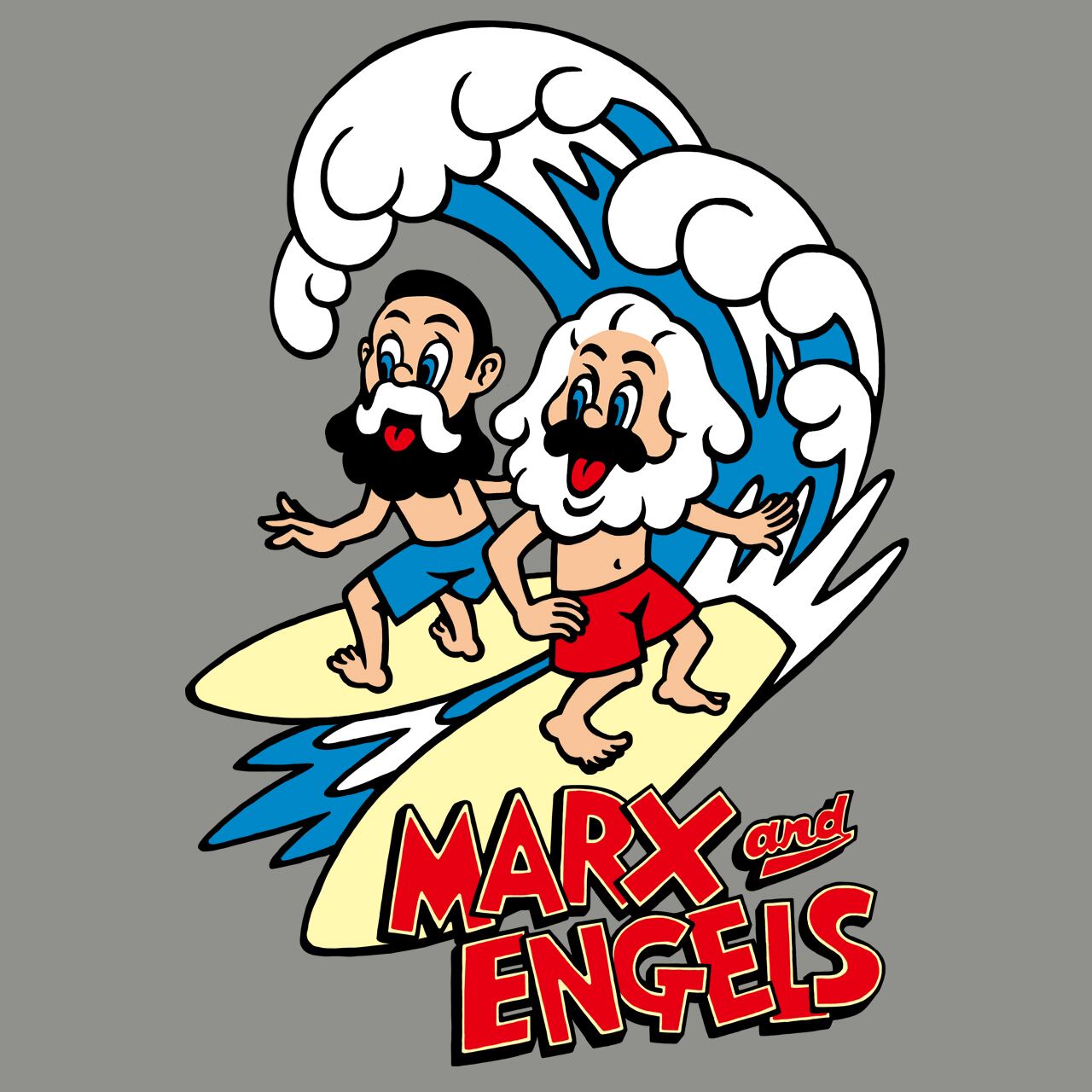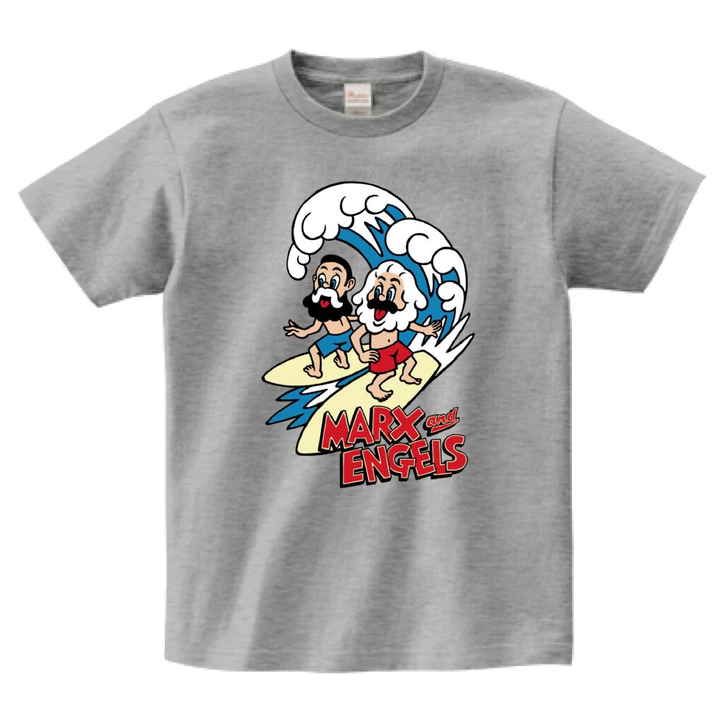 スタンダードなシルエットのTシャツに、思想家のマルクスとエンゲルスらしきヒゲ男が、アメリカのアニメキャラっぽい絵柄でプリントされています。
